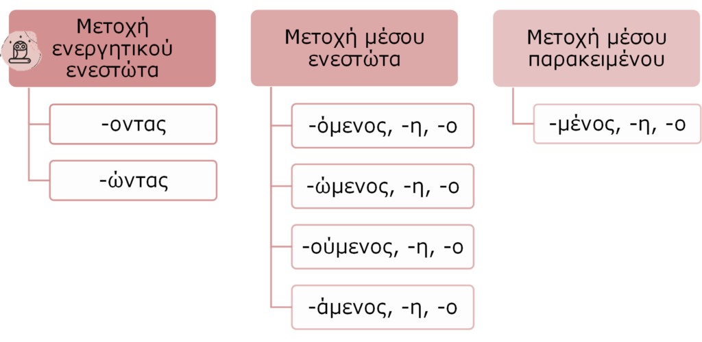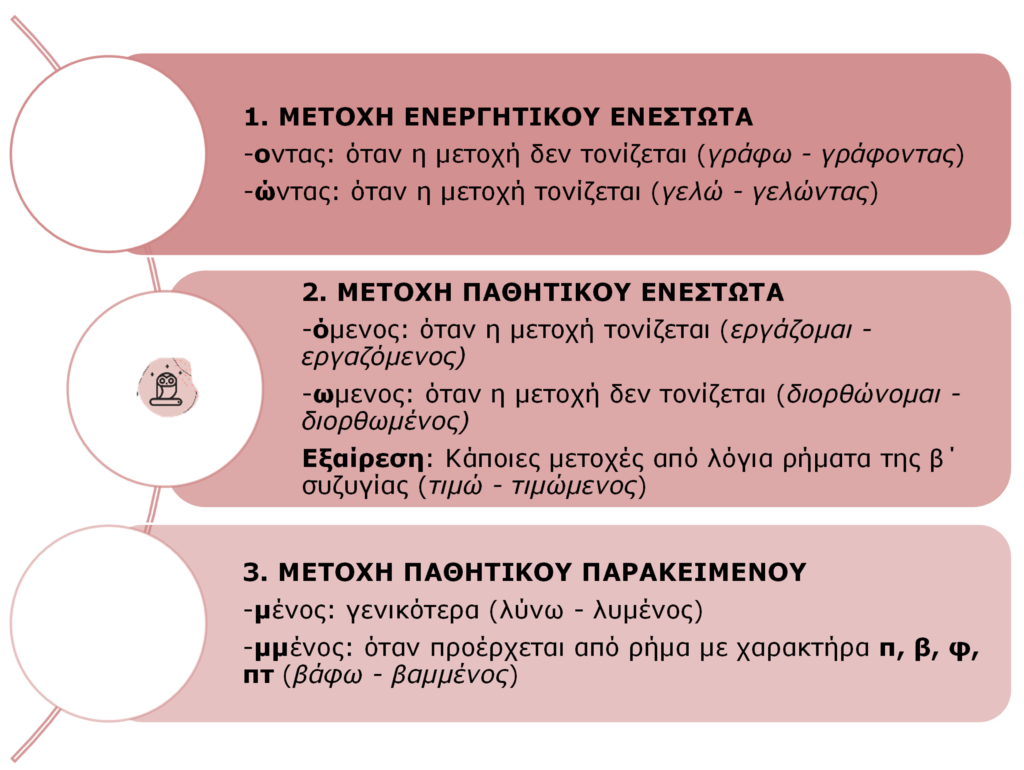 - με κατάληξη -ων, -ούσα, -ον, π.χ. υπογράφων, υπογράφουσα, υπογράφον κ.ά.