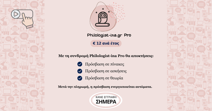Δεν είσαι μέλος στην Philologist-ina Pro ακόμα; Μπες στη σελίδα Philologist-ina Pro και κάνε τώρα την συνδρομή σου!